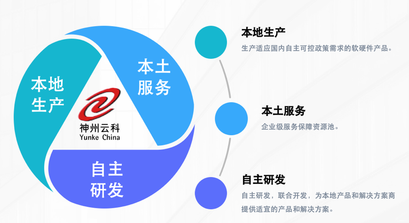 紧跟国家自主可控战略,神州云科通过“本地生产、本土服务、自主研发”的战略路径,打造自主品牌、生产自主产品,为合作伙伴提供神州数码自主品牌、自主知识产权的云基础设施产品、服务及解决方案。