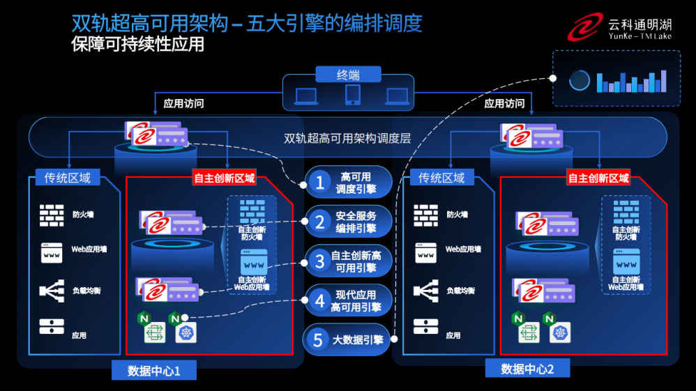 为实现双轨超高可用架构信创区和非信创区的跨域协同,实现信创区域和非信创区域的平滑过渡,神州云科通过五大引擎实现多层次的应用可持续性。